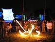 Festivalkult in Veltheim: direkt hinter dem Kraftwerk hatte sich die Festivalgemeinde des Umsonst und Draußen auf den Wiesen breit gemacht, um drei tolle Tage bei herrlichem Sommerwetter zu erleben. Das Highlight war der Auftritt der Südstaatenrocker Tito & Tarantula am Freitag Abend (ab Bild 7). Das Quartett erreichte Kultstatus durch den Quentin-Tarantiono-Film "From Dusk Til Dawn" und präsentierte seinen düsteren Gitarrenrock vor einer dicht gedrängten Besucherschar. Die Fans vor der Bühne kannten kein Halten und wurden am Ende des kurzen Sets für einen Song von Tito selbst auf die Bühne gezerrt. So wurde die Band nicht ohne ein paar Zugaben von der Bühne gelassen, aber nach einer knappen Stunde war endgültig Schluss. In der Umbaupause probierten sich Feuerkünstler (ab Bild 37) vor dem Tekknozelt.